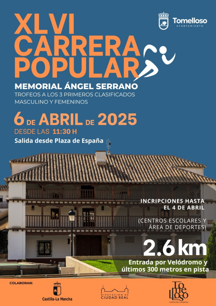 XLVI CARRERA POPULAR «Memorial Ángel Serrano». Trofeos a los tres primeros clasificados (masculinos y femeninos). Salida desde la Plaza de España. Inscripciones hasta el 4 de Abril. (Centros Escolares y Área de Deportes). 2,6 KM.