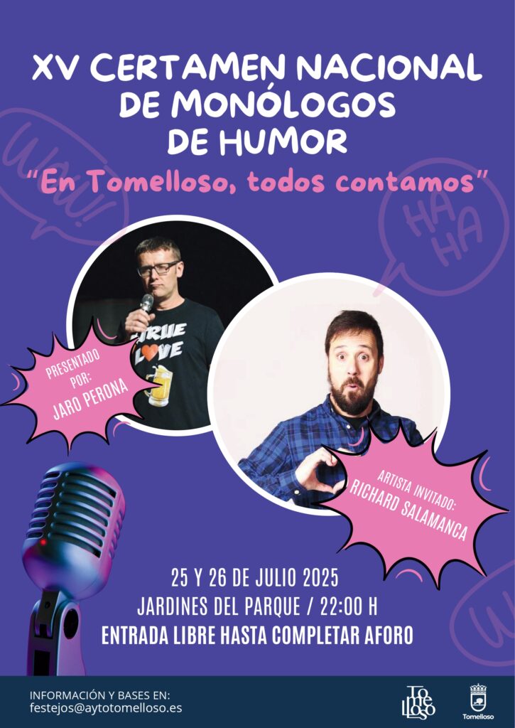 XIV CONCURSO NACIONAL DE MONÓLOGOS DE HUMOR «En Tomelloso todos contamos». El próximo 26 y 27 de Julio a las 22:00 h tenéis una cita con el presentador Jaro Perona, en los Jardines del Parque con entrada libre.