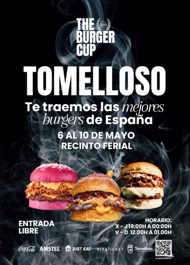 THE BURGER CUP TOMELLOSO Del 6 al 10 de mayo en El Recinto Ferial. Entrada libre. HORARIO. Miércoles y jueves : 19:00 a 00:00 h. Viernes, sábado y domingo : 12:00 a 01:00 h.